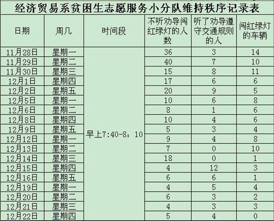 每天安排2-3人带上志愿者红帽和“文明过马路、礼让斑马线”的绶带,劝导行人文明过马路。并记录下来那些不听劝导闯红绿灯的人数、以及经过劝导后遵守交通规则的人,还有记录闯红绿灯的来往车辆。目的是在早晨人流量最大的时候能够维持好校门口的交通安全,劝导师生及车辆文明过马路,为大家创造一个安全、和谐的环境。
