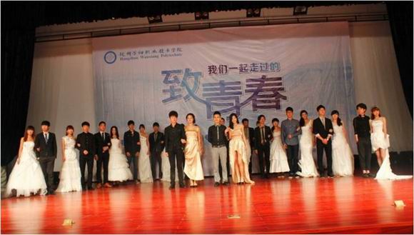 似水流年在今天都化作了美好的回忆,晚会以“致我们一起走过的青春”为主题,在器乐社的一首《说好的幸福》歌声中完美开场;话剧社则将《守望》、《落叶归根》两大话剧依次搬上舞台;一首首精彩的歌曲和风格各异的舞蹈节目串联了本台晚会;晚会最高潮则是由礼仪社同学们带来的2013届服装专业毕业生毕业作品的婚纱、礼服走秀,一件件别样精致的服装作品辅以礼仪社同学优雅地展示,博得在场师生的热烈掌声和欢呼叫好。最后,晚会在一曲《年轻的战场》歌声中顺利结束。