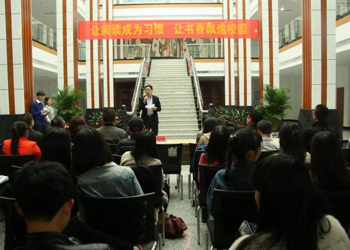 在热烈的掌声中,学院副院长朱仁学教授致开幕辞。他首先向师生们介绍了第20个世界读书日情况,并对本次读书文化节即将开展的系列活动作了介绍和要求,并引用博尔赫斯说过的一句话:“如果有天堂,天堂就应该是图书馆的模样。”号召广大师生多到图书馆,参与爱书、荐书、读书活动之中,他指出“读书是一个永远的话题,是推动一个集体向上和促进个人成长、成才的动力”。最后朱院长预祝本届读书文化节取得圆满成功!
