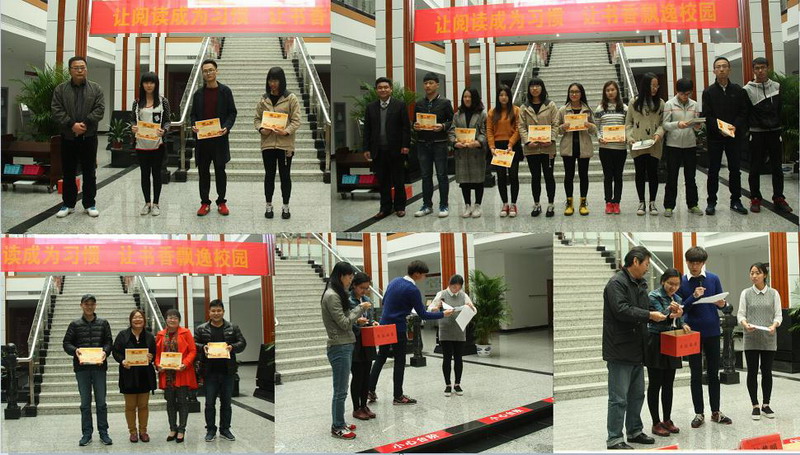 随后图书馆对2014年度优秀读者进行了表彰,优秀读者代表龚立明老师,罗鑫锋、王瑜同学现场分享了他们的阅读感悟,用他们真实的体会引导大家去阅读。除此之外,现场还进行了知识竞答活动,同学们在答题过程中对阅读知识有了更多的了解。最后,主持人邀请高兰老师和鲍黎明老师现场抽取了“你挑书,我买单”活动的10位幸运读者,这些幸运读者将获赠心仪的图书一册。