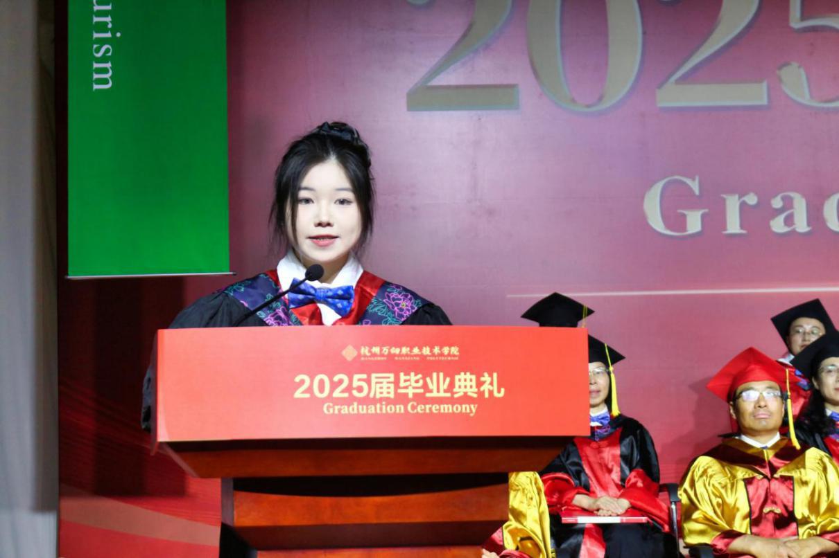 毕业生代表、工商企业管理 222 班的王苡宁深情回忆在万院求学的青葱岁月是“一首寻找与蜕变的诗”,字里行间满是对母校和师长的感恩。面向充满无限可能的未来,她坚定地说:“人生本无标准答案,正如万向从田野迈向世界的征程所证:起点从不会束缚终点。每一份忠于热爱的选择,都在让时代江河更显壮阔。”