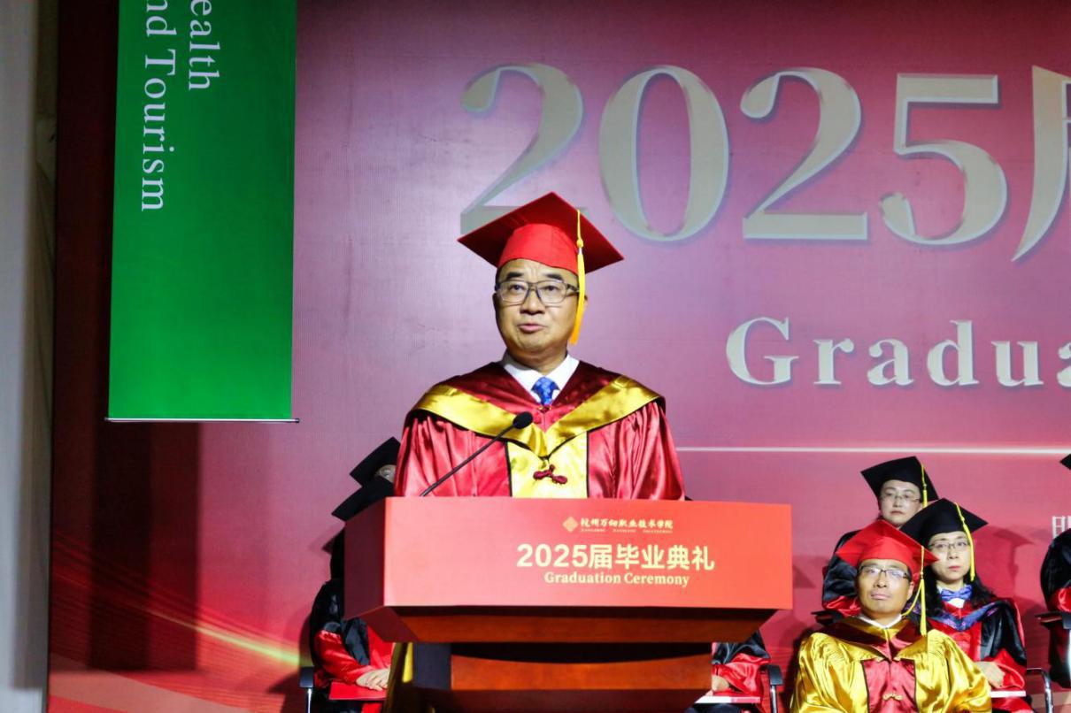 “回顾你们在校的这三或五年,最令我们欣慰的,是看到每一位同学的成长与蜕变!”牟惠康院长和毕业生回顾了难忘的万院时光,向全体毕业生致以诚挚的祝福,并发表了题为《压力变动力,平凡见英雄》的讲话。他语重心长地嘱托同学们:“ 在多元变革、机遇挑战并存的时代,压力是锻造伟大的熔炉。愿你们如钱塘怒潮劈开前路,以工匠之心在每个平凡的岗位雕刻不朽丰碑,勇立时代浪尖,成为自己命运的真正英雄!”