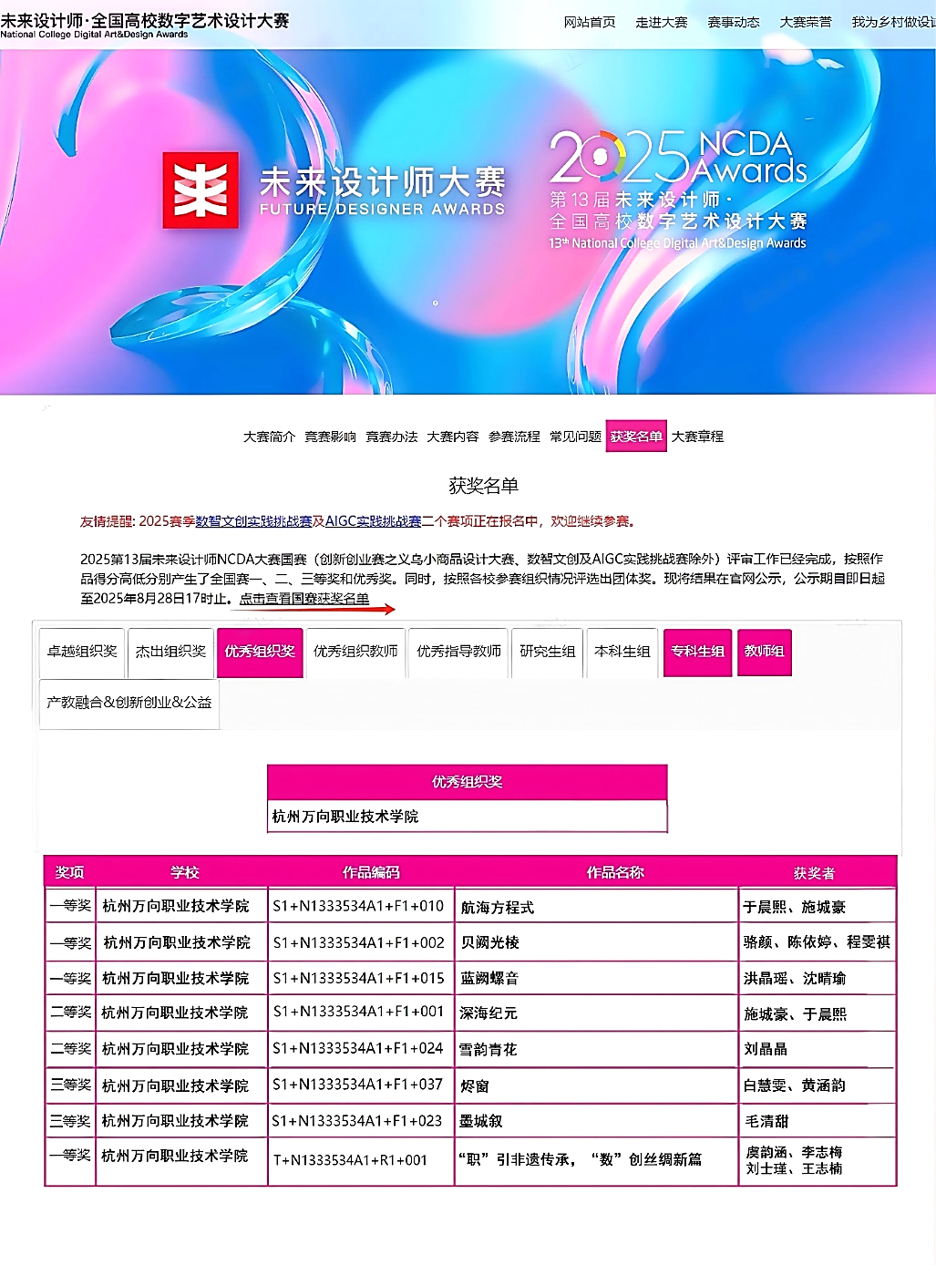 近日,2025第13届未来设计师・全国高校数字艺术设计大赛(NCDA)国赛结果揭晓。我院设计创意系服装设计与工艺专业师生再创佳绩,第三次蝉联国赛一等奖4项、二等奖2项、三等奖2项,获浙江赛区一等奖9项。