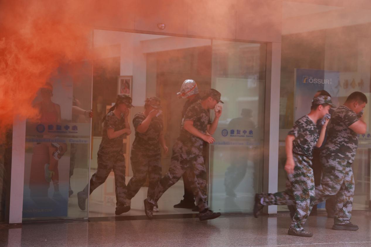 在AED(自动体外除颤仪)专项培训现场,专业讲师以“理论讲解+实操演练”相结合的方式展开教学,系统讲解了心脏骤停的急救原理、AED的工作机制及“黄金4分钟”的急救意义,手把手指导新生进行胸外按压、人工呼吸及AED设备操作,帮助新生对急救流程建立科学认知。消防疏散演练中,随着哨声响起、浓烟漫出,全体新生在教官及安全员的引导下,分批次用湿毛巾捂住口鼻,弯腰低姿,沿着指定疏散路线快速有序地撤离至安全区域。