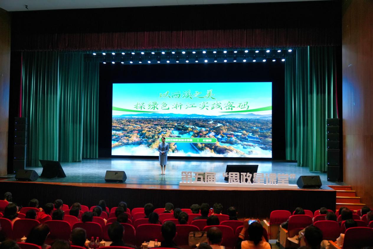 在现场展示环节,叶丽娜老师以《以西溪之美探绿色浙江实践密码》为题,巧妙运用AI播报等现代教学技术,结合生动语言与鲜活案例,将毗邻学院的西溪国家湿地公园作为教学蓝本,贯通浙江生态文明建设的历史与现实,生动呈现了绿色发展的“浙江成果”,深刻阐释了 “绿水青山就是金山银山” 的治理理念与实践路径。